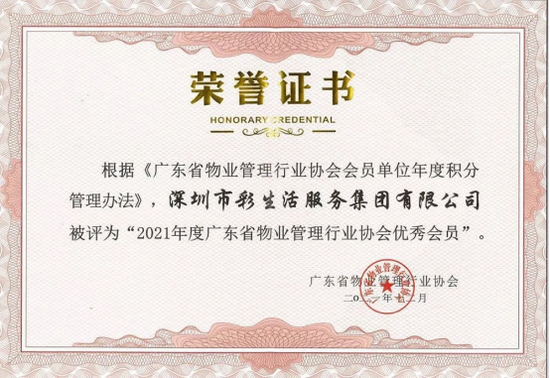 2021年12月15日,在廣東省物業(yè)管理行業(yè)協(xié)會“第五屆第五次會員(代表)大會暨理事(監(jiān)事)會會議”及“2021廣東省物業(yè)服務企業(yè)綜合發(fā)展研究成果發(fā)布會”上,彩生活憑借綜合實力和業(yè)界口碑,榮獲“2021廣東省物業(yè)服務綜合發(fā)展實力企業(yè)”、“2021年度廣東省物業(yè)管理行業(yè)協(xié)會優(yōu)秀會員”、“2021大灣區(qū)物業(yè)服務品牌企業(yè)”三項獎項。
